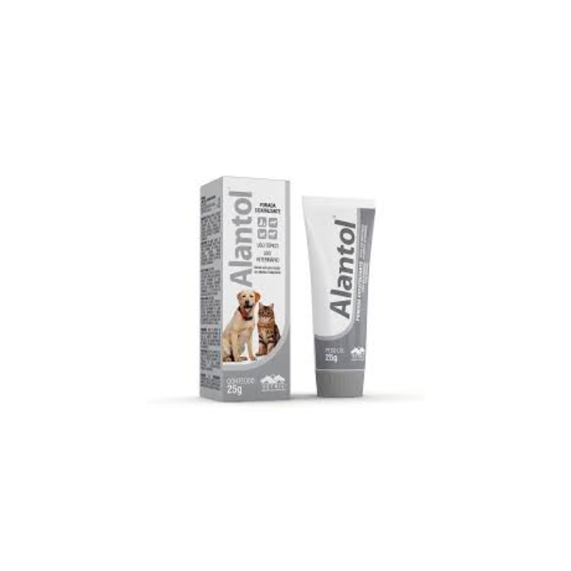 <p>A Alantol é uma pomada cicatrizante da Vetnil exclusiva para uso em cães, gatos e equinos. Ela serve para o tratamento de lesões cutâneas, feridas acidentais ou cirúrgicas, abcessos, escoriações de decúbito, ulcerações de superfície e queimaduras, somente com supervisão de um médico-veterinário.</p>